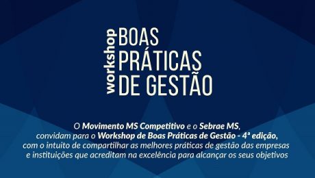 No dia 02 de agosto, quinta-feira, o Movimento MS Competitivo e o Sebrae-MS realizam o 4º Workshop de Boas Práticas de Gestão, com circuito de palestras e também mesa de experiências. O objetivo é compartilhar as melhores práticas de organizações, sejam empresas ou instituições, que se pautam pela excelência.