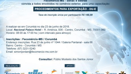 Será realizado no próximo dia 23 de junho o curso "Procedimentos para Capacitação do DU-E". Ele será oferecido no Hotel Nacional, em Corumbá, a partir das 8h. O DU-E é um procedimento obrigatório da Receita Federal nas operações de exportações.
