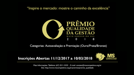 Termina no dia 10 de março o prazo para inscrições ao Prêmio Qualidade da Gestão MS (PQG/MS), do Movimento Mato Grosso do Sul Competitivo. Organizações devem acessar o portal do MS Competitivo.